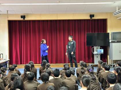 鶴見区住みます芸人の「国道アリス」さん、構成作家の大工富明さんに講師としてお越しいただきました。一緒に漫才の練習を行い、ネタを磨いた後、2クラスずつに分かれてお披露目会を行いました。