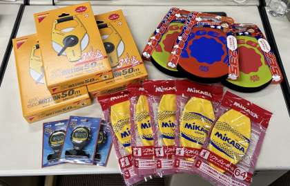 ベルマーク運動により集まった点数で、ソフトバレーボール10個、ストップウォッチ5個、メジャー(50m)3個、ドッヂビー10枚を購入しました!