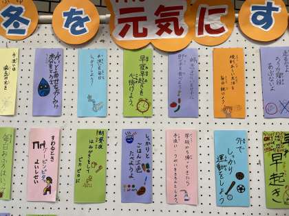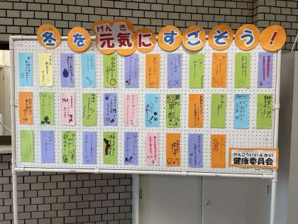 健康委員会で、冬を元気に過ごすためにはどんなことに気をつけたらいいかを標語にしました。玄関のところに掲示していますので、ご覧ください。