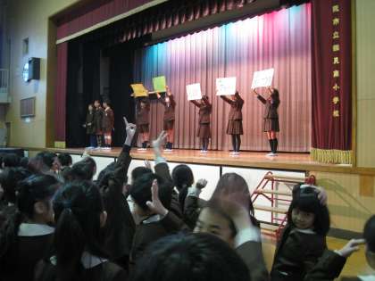 続けて児童会代表委員会から、赤い羽根共同募金の結果がクイズ形式で知らされました。また今週から始まっているあいさつ週間について、「あいさつする人もされる人も笑顔になれるような気持ちの良いあいさつをしよう」という目標が紹介されました。今週は代表委員が毎朝先生といっしょに玄関に立ちます。自分から進んで気持ちの良いあいさつができるようにしましょう。