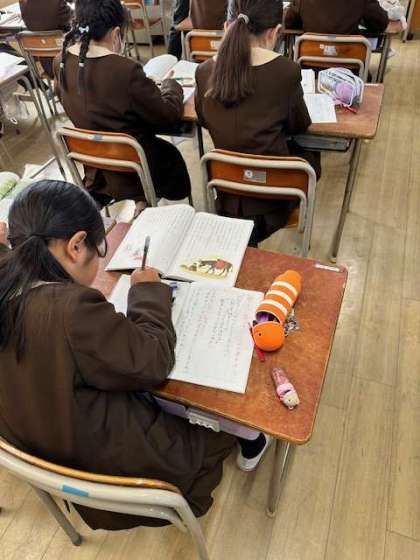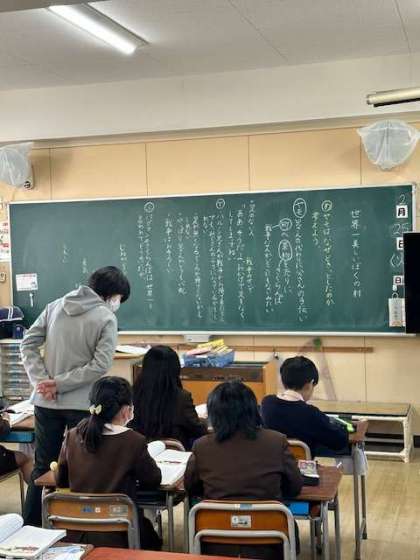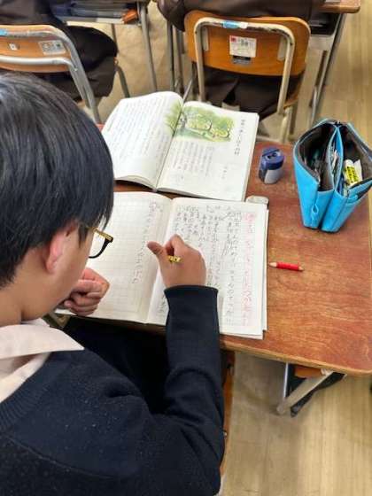 四年生の国語では物語文を使っての学習でした。物語をよく読んで、自分の考えを細かくノートにまめていました。驚くほど、細かく上手に自分の考えをノートにまとめていました。四年生のまとめに近づいています。「書く」ということに自信がついてきたようです。