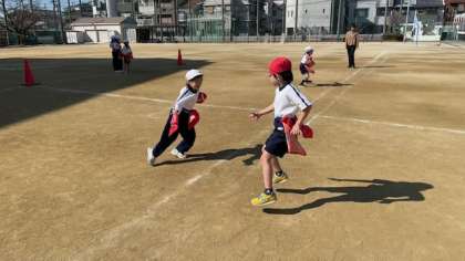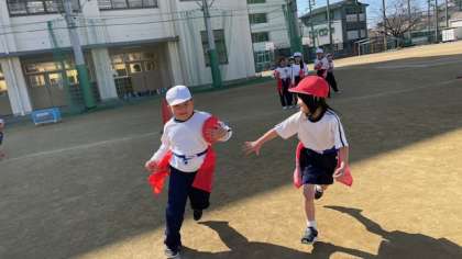 本日から1年2組の児童は本格的にフラッグフットボールの学習に取り組んでいます。少し暖かくなってきたこともあり、汗を流して楽しんでいる様子がみられました。