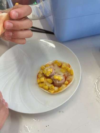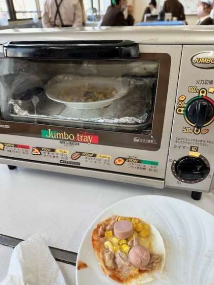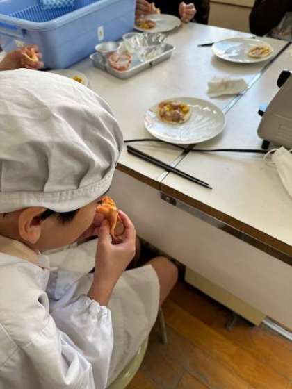 五年生は調理実習で変わりピザを作っていました。餃子の皮にコーンなどをのせてオープントースターで焼きます。とても美味しそうでした。