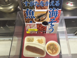 写真左は本日の献立サンプルです。本日の給食図書は「すがたをかえる 魚・海そう」でした。図書には、工場でのツナ缶の作り方が載っていました。