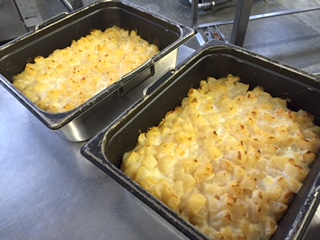 桃のクラフティは、ミニバットにコーンフレークを敷き、白桃缶が入った生地を流し入れ、焼き物機で焼いた、デザート献立でした。