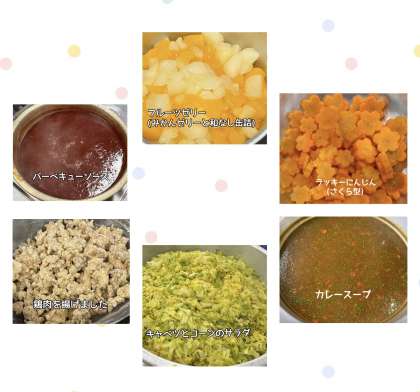 初登場の「あげどりのバーベキューソース」は、下味をつけて揚げた鶏肉にケチャップなどで作ったタレをからませています。デザートの「フルーツゼリー」はみかんゼリーと和なしの缶詰を合わせています。これにサラダと児童に好評なカレースープを組み合わせています。スープには、さくらの型のラッキーにんじんが入っています。
