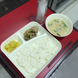 本日の献立は「かす汁・豚肉のごまだれ焼き・くりきんとん・ごはん・牛乳」でした。