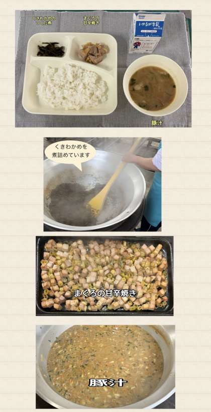 ※まぐろの甘辛焼き ※豚汁 ※くきわかめのつくだ煮