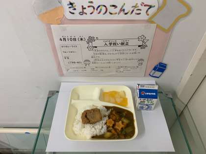 今日の給食は、みなさんが小学生になったお祝いの献立です。