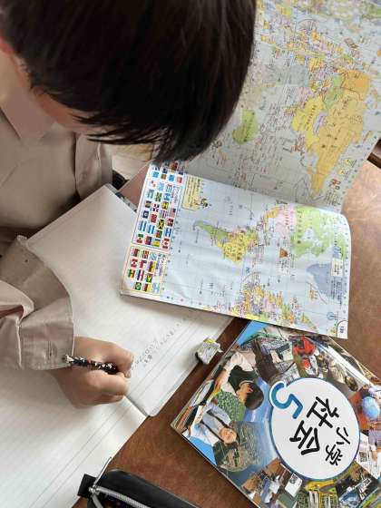 今日はすくすくテストを終え、音楽や社会などに力を注いで頑張っていました。音楽では旋律を意識して歌うことができました。社会科では日本の位置などについて、地図帳や地球儀を使い、調べることができました。