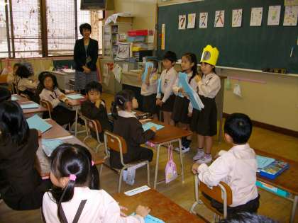 1年生は国語「クイズ大会をしよう」を各組で行い、一人一人がいろいろな乗り物の本を読んで考えたクイズをお互いに出し合いました。