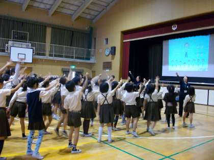 3年生は英語活動(総合)「アルファベットにしたしもう」を4クラス合同で講堂で行い、英語の歌やゲームやフォニックスを楽しく学習しました。