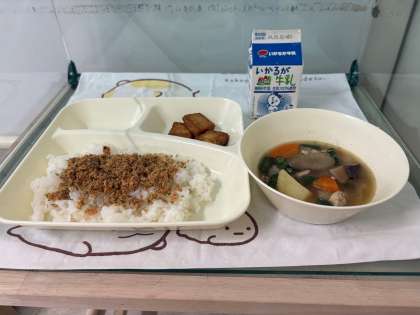 ※鶏肉とじゃがいもの煮物もの ※あつあげのしょうゆだれかけ ※紅ざけそぼろ ※ごはん ※牛乳