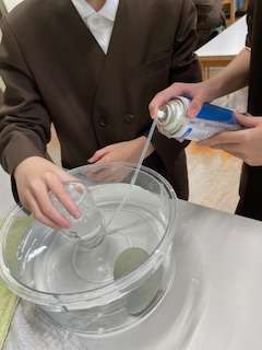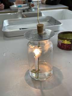 「燃やすはたらきのある気体」の学習で、酸素を瓶に集めました。そこへ、火のついたろうそくを入れました。明るく激しく燃える様子を見ることができました。