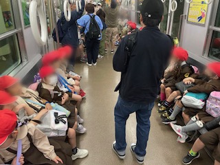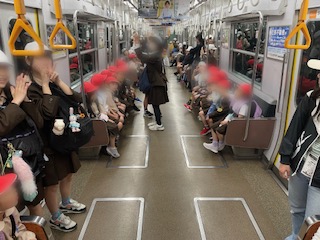 万博の見学に向けて昨年度から移動行進の際の曲として、万博テーマソングであるコブクロの『この地球(ほし)の続きを』を流し続けてきました。子どもたちに耳慣れた曲が流れる中、専用列車の旅を楽しみます。