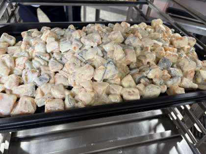 かぼちゃに野菜ブイヨン、ノンエッグドレッシングを合わせて下味をつけ、焼き物機で焼きます。