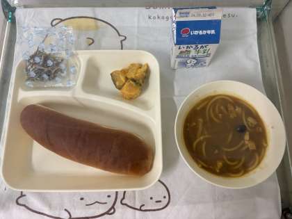 ※カレースープスパゲッティ ※かぼちゃのマリネ焼き ※ミニフィッシュ ※黒糖パン ※牛乳