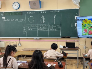 今日は、ホウセンカやマリーゴールド、ヒマワリのたねを観察しました。虫眼鏡を使って、形や大きさなどを比べることができました。