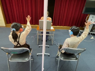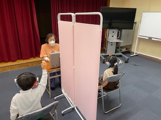 手を挙げて知らせます。聴力検査は