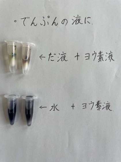 この実験では、ヨウ素液を使って色の変化で調べました。でんぷん+水では、こい青むらさき色に変化しました。でんぷん+だ液では、色は変化しませんでした。結果、だ液には、でんぷんを別のものに変化させるはたらきがあることを知りました。