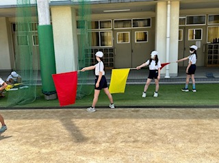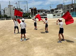 8拍のカウントに合わせて動きを考えたり、1人2本のフラッグを使ったり、途中でフラッグを交換したり・・・それぞれが自分のグループなりに工夫をして、練習を頑張っています。