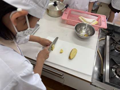 じゃがいもを切って茹でて食べました。初めて包丁を使っての調理実習でしたが、どの班も協力して片付けまですることができました。