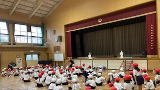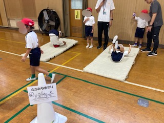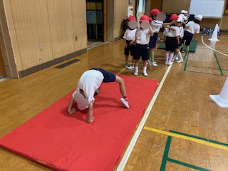 今週の体育は、講堂で3クラス合同でマットや平均台、ボールなどを使った運動遊びを行います。子どもたちは、同じグループの人と協力して楽しく活動していました。