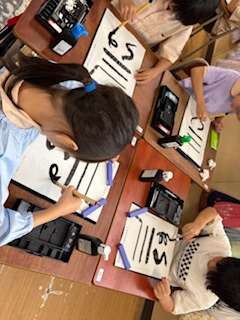 習字の様子です。初めての毛筆のため、用具の準備、書くときの姿勢、筆の持ち方を確かめました。