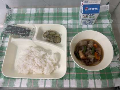※牛肉と野菜のいため煮 ※きゅうりともやしのおひたし ※焼きのり ※ごはん ※牛乳