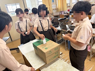 政治の学習の最後には、模擬選挙を体験しました。税金や選挙について勉強してきたからこそ慎重に選ぶ姿が見られました。