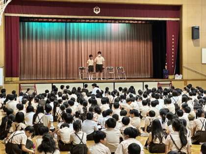 なかよし集会の後は、児童会からお知らせがありました。広島の平和公園に千羽鶴をお供えするために、みんなに鶴をおってほしいということでした。そのための集会もあるそうです。それぞれの委員会が素晴らしい活躍をしていました。