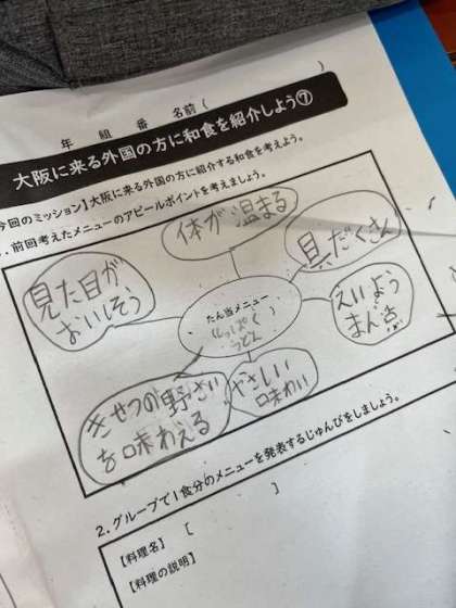 4人班に分かれて和食の献立を作り、発表をする練習をしています。