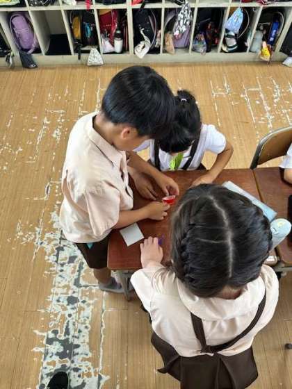 今日は、折り鶴集会がありました。縦割り班ごとにあつまって、六年生の修学旅行用の鶴をおります。