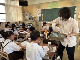 歯みがきの指導があり、フッカ物の洗口をしました。ちょっとりんごの味がしました。