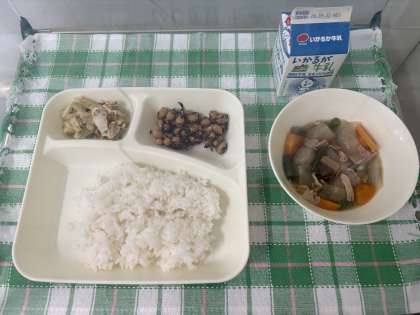 ※豚肉と野菜の煮もの ※ひじき豆 ※ささみとキャベツのごまみそ焼き ※ごはん ※牛乳