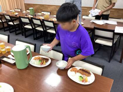 食事係が夕食の準備中。