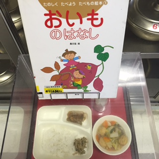 写真中央は本日の給食図書と献立サンプルです。本日の給食図書は「おいものはなし」でした。さといもや、さつまいも、じゃがいも等の生態や栄養の違い等が載っていました。