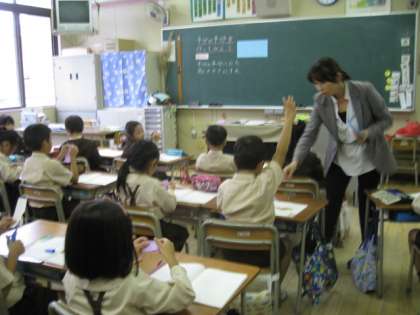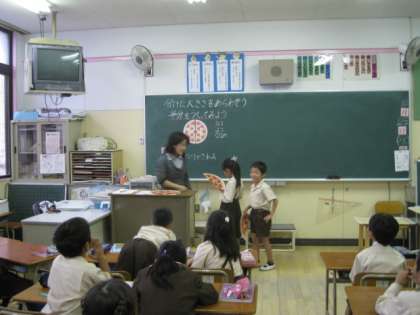 2年生の子どもたちはピザの絵を半分に切ったり、折り紙を半分の半分に切ったりして、友だちと考えを交流し、みんなの前で発表して「分数」について学習を深めました。