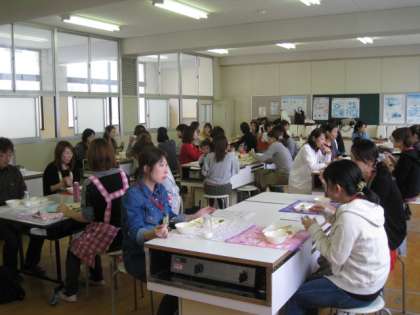 三つ目はPTA給食試食会です。家庭科室に33名の申込者の方が集まり、今日の献立「白菜のクリーム煮、揚げギョーザ、あっさりキュウリ」をいただきました。試食後には栄養士さんのお話を聞き、「おいしかった。」「栄養のバランスがよく考えられていることがわかりました。」という感想を多く聞きました。