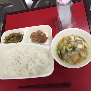 本日の献立は「鶏肉のしょうゆバター焼き・五目汁・きんぴらごぼう・ごはん・牛乳」でした。