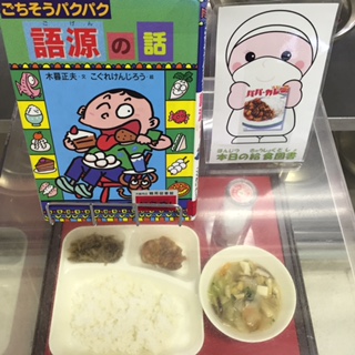 写真中央は本日の給食図書と献立サンプルです。本日の給食図書は「ごちそうパクパク 語源の話」でした。本日の「きんぴらごぼう」の語源や「大根役者」の語源等が載っていました。