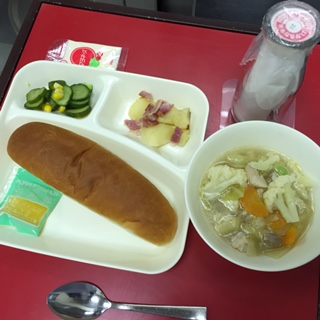 本日の献立は「鶏肉と野菜のスープ煮・野菜サラダ・ジャーマンポテト・パン・牛乳」でした。