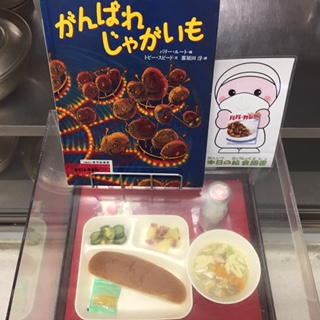 写真中央は本日の給食図書と献立サンプルです。本日の給食図書は「がんばれ じゃがいも」でした。野菜の品評会で優勝したじゃがいもたちが、夜のお祭り広場で大騒ぎをするアメリカの絵本です。