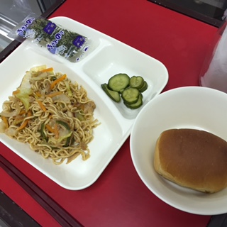 今年度最初の献立は「焼きそば・きゅうりのしょうがづけ・パン・牛乳」でした。