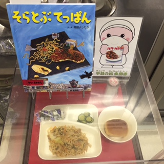 写真中央は本日の給食図書と献立サンプルです。本日の給食図書は「そらとぶてっぱん」でした。話すことのできる鉄板が空を飛ぶ愉快な絵本でした。