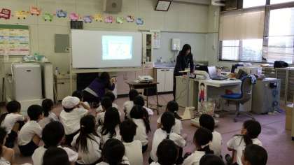 5年生は「ホタル博士」の西岡先生にホタルの生態について教えてもらった後、一人一人がホタルの幼虫を預って名前を付けました。今日持ち帰るので夜観察すると、光るのが見えるそうですよ。