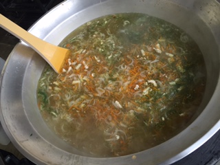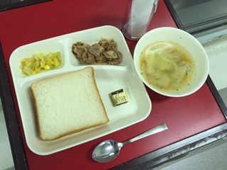 スープは、鶏肉、にんじん、たまねぎ、キャベツ等が入った、スープ献立でした。