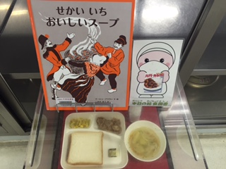 写真中央は本日の給食図書と献立サンプルです。本日の給食図書は「せかい いち おいしいスープ」でした。お腹をすかせた兵隊が石だけでおいしいスープを作るという、興味深い図書でした。