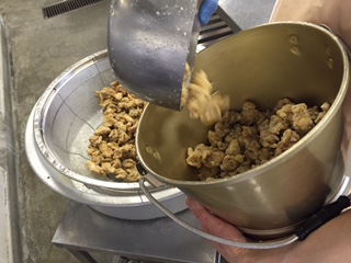 写真右は揚がった、からあげを配缶している様子です。
