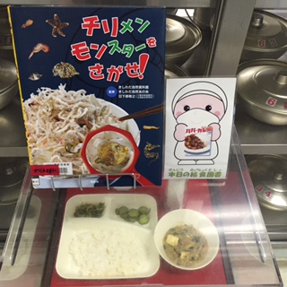 写真中央は本日の給食図書と献立サンプルです。本日の給食図書は「チリメンモンスターをさがせ!」でした。じゃこと一緒に水揚げされる、いろいろならカニや小魚の稚魚が詳しく載っている図書でした。なお、給食で使用されるちりめんじゃこも、エビやカニが混ざる漁法で捕獲しています。